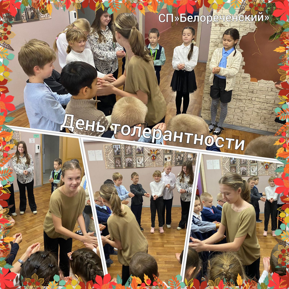 В преддверии Международного дня толерантности в СП «Белореченский» прошли мероприятия в рамках этого праздника, который традиционно отмечают 16 ноября. Классные руководители провели классные часы «Мы разные-в этом наше богатство». Для учащихся начальной школы силами учеников 6-х классов под руководством педагога-психолога Корольковой Н.Н. были организованы игры на умение взаимодействовать в коллективе.
