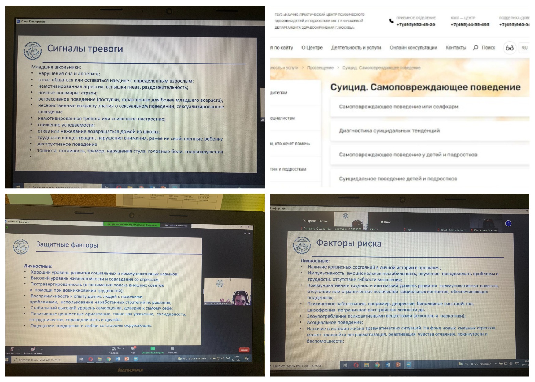 В рамках повышения квалификации специалисты службы психолого-педагогического сопровождения посетили серию вебинаров по «Профилактике суицидального поведения у детей и подростков», организованных Научно-практическим центром Психического здоровья детей и подростков им. Г.Е.Сухаревой Департамента здравоохранения г. Москвы.