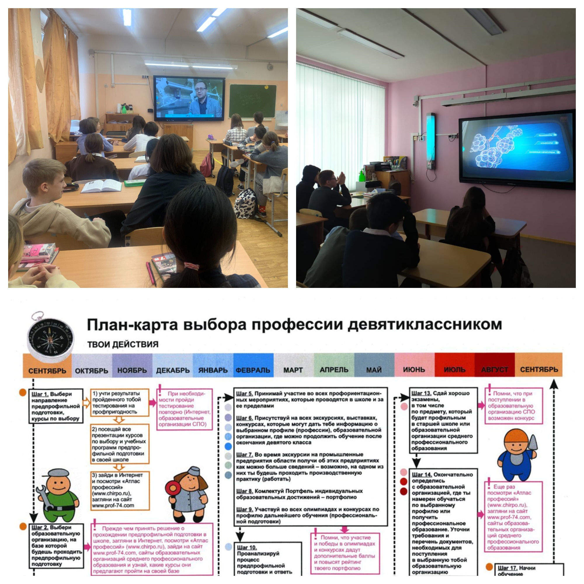 Особой популярностью среди детей пользуется профориентационный марафон «Профессии наших родителей», когда родители обучающихся записывают небольшие ролики о своей профессии, своем рабочем дне и особенностях своей работы, чтобы наглядно показать обучающимся что это такое — быть специалистом в той или иной сфере. Учащиеся 9-го класса посредством смс-рассылки получили «План-карту выбора профессии».