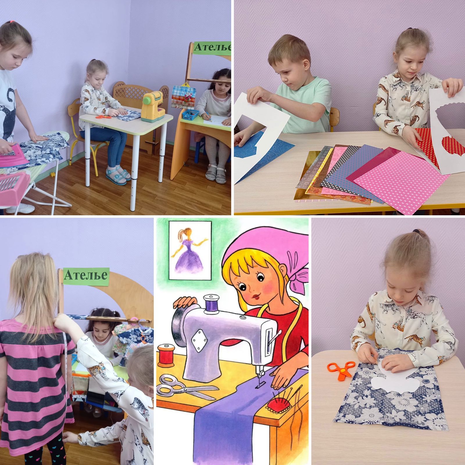 ДО «Надежда»: в центре внимания сегодня была игра «Ателье», где работают люди с разными профессиями (закройщик, швея, мастер по швейным машинам); дети рассматривали разные ткани, учились делать выкройки и чертежи, создавали авторские модели одежды.
