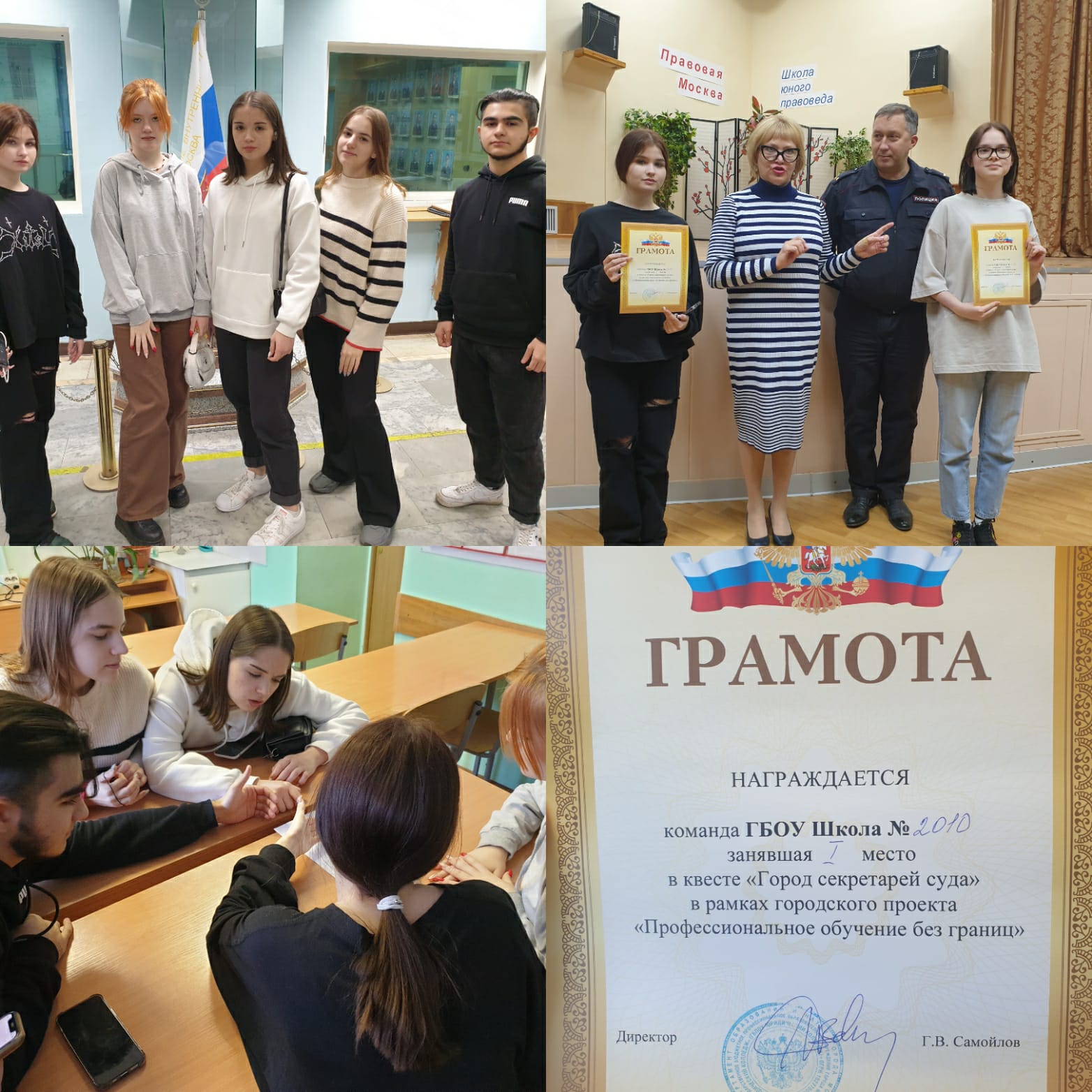 В рамках проекта "Профессиональное обучение без границ" учащиеся школы 2010 приняли участие в квесте по профессии "секретарь суда" в Юридическом колледже. Заняли первое место по результатам всех этапов соревнования. Молодцы!!!